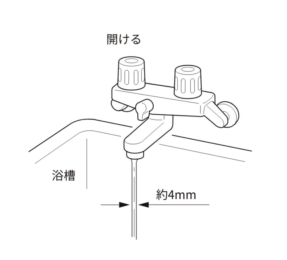 お風呂のお湯の蛇口から、太さ約4mm(400cc/分)程度の細さで水を流したままにしておいてください。